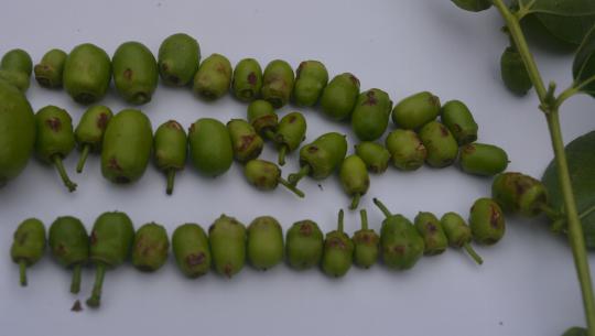 發(fā)病后期,棗吊發(fā)病部位失水,有的棗吊則出現(xiàn)斷裂,花蕾脫落。發(fā)生嚴(yán)重時花蕾較少甚至形不成花蕾,座果率顯著降低,甚至座不住果子。后期則棗吊干枯,棗吊上坐住的果實,由于營養(yǎng)不良,品質(zhì)受到很大影響.