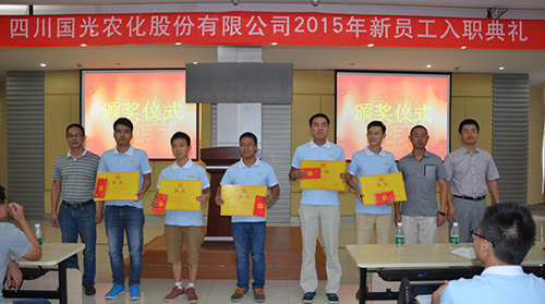 2015年7月16日,國光股份舉行了2015年新員工入職典禮,138名新員工光榮地加入國光大家庭。公司總經理及部分高管致辭,對新員工表示熱烈歡迎,并寄予了殷切期望,要求新員工要以“和、誠、真、新”的做人態度、“定、思、行”的做事方式,用感恩和愛的心態努力學習和工作。新員工代表謝超熱情洋溢地談感受、表決心,贏得了全場的掌聲!在典禮上還為特別優秀實習生候陽;優秀實習生:晏國強、王恒、謝超、芧萬宇頒發了獎狀和獎金。