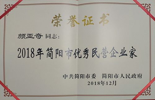 公司被授予“2018年簡陽市優秀民營企業”,公司總經理顏亞奇被授予“優秀民營企業家”。
