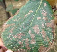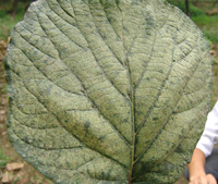 4月中旬,病原菌由葉背面開始侵染,為侵染的初期。5-6月份,氣溫20-24℃,更有利于侵染,此時期是侵染高峰期。7-8月為發病高峰期(此時期高溫高濕)葉部癥狀明顯,開始是小病斑,后逐步擴大,葉片后期干枯,大量落葉。到8月下旬開始大量落果。