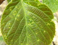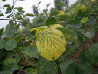獼猴桃病毒病有獼猴桃花葉病。。表現為葉部有鮮黃色不規則線狀或片狀斑,病健部交界明顯,葉脈和脈間組織均可以發病,嚴重影響葉片的光合功能。