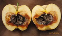 只危害果實。分為霉心型和心腐型。初期心室組織變褐壞死,后向外擴展,果肉變褐色或者深褐色,味苦,可從果柄洼出爛透。心室內充滿白色、黑褐色、青綠色或者粉紅色霉層,以粉紅色霉層最常見。幼果發病,內外常包敷紅粉。北斗、元帥系品種的病果易脫落,青香蕉的病幼果多在樹上變黃,國光則干縮成黑色小僵果,掛在樹上經冬不落。