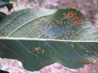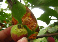 病菌在檜柏上為害小枝,即以茵絲體在菌癭中越冬。第二年春天形成褐色的冬孢子角。冬孢子柄被有膠質,遇降雨或空氣極潮濕的胺化膨大,冬孢子萌發產生大量擔孢子,隨風傳播到蘋果樹上。銹菌侵染蘋果樹葉片、葉柄、果實及當年新梢等,發病期持續一個月。