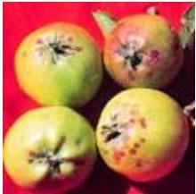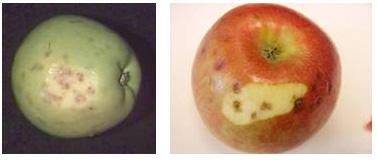 病果皮下果肉首先變褐,干縮成海綿狀,逐漸在果面上出現圓形稍凹陷的變色斑,病斑在黃色或綠色品種上為暗綠色,在紅色品種上為暗紅色。后期病部果肉干縮,表皮壞死,顯現出凹陷的褐斑。病部食之有苦味。