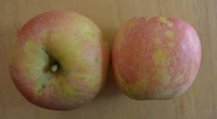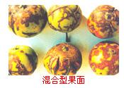 2.花臉型,著色后果面散生近圓形黃綠色斑塊,成熟后為紅綠相間的花臉狀。黃色品種如黃龍、黃沙果、黃太平蘋果等病果成熟后果面色澤不勻,出現濃淡相間的斑塊,果面略呈凹凸不平狀。