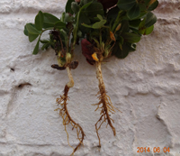 癥狀:花生根結線蟲病主要為害植株的地下部,因地下部受害引起地上部生長發育不良。幼苗被害,一般出土半個月后即可表現癥狀,植株萎縮不長,下部葉變黃,始花期后,整株莖葉逐漸變黃,葉片小,底葉葉緣焦灼,提早脫落,開花遲,病株矮小,似缺肥水狀,田間常成片成窩發生。雨水多時,病情可減輕。