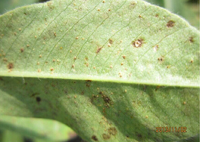 癥狀:花生銹病在各個生育階段都可發生,但以結莢期以后發生嚴重。主要侵染花生葉片,亦可為害葉柄、托葉、莖稈、果柄和莢果。葉片染病初在葉片正面或背面出現針尖大小淡黃色病斑,后擴大為淡紅色突起斑,表皮破裂露出紅褐色粉末狀物,即病菌夏孢子。下部葉片先發病,漸向上擴展。葉上密生夏孢子堆后,很快變黃干枯,似火燒狀。葉柄、托葉、莖、果柄和果殼染病夏孢子堆與葉上相似,托葉上的夏孢子堆稍大;葉柄、莖和果柄上的夏孢子堆橢圓形,長1~2mm,但夏孢子數量較少。