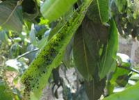 癥狀: 芒果蚜蟲以成蟲、若蟲均集中于嫩梢、嫩葉的背面,花穗及幼果柄上吸取汁液,引起卷葉,枯梢,落花落果,影響新梢伸長,嚴(yán)重時導(dǎo)致新梢枯死。屬常發(fā)性主要害蟲。同時還分泌蜜露,誘發(fā)煤煙病。