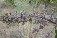 癥狀:是花期的主要病害,同時危害幼果、嫩葉,嚴(yán)重影響果實產(chǎn)量。該病主要為害花序、幼果和嫩葉。花序枝梗最容易受感染,梗上病斑褐色,病部常見白粉狀物,花梗環(huán)縊狀死亡,其上花朵、幼果隨之枯死脫落。嫩葉癥狀多在葉背,病葉常扭曲、畸形。幼果受害,果面出現(xiàn)近圓形的斑點,嚴(yán)重時幼果全部被白粉狀物覆蓋,造成大量落果。