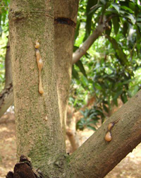 發(fā)生原因:在幼果發(fā)育至橄欖大時即開始裂果,到果實有雞蛋般大小即進入迅速膨大期至生理成熟前期時達到最高峰。裂果率因品種不同,差異也很大。象芽芒一類的品種最易裂果。果實被蟲咬傷或機械傷后,若遇驟雨,吸水過多,則會造成突發(fā)性裂果。所以裂果既屬生理性病害,也受外界環(huán)境的影響。要解決裂果問題,必須采取綜合性的措施。