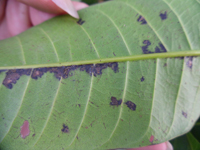 癥狀:該蟲以芒果嫩葉為食料,每年5~11月均有發(fā)生,主要以幼蟲危害嫩葉、葉柄和主脈,被害葉呈褐斑狀,與葉斑病近似,葉背面有小點凸起,后期穿孔破裂,葉片卷曲,嚴(yán)重時致辭使葉片枯萎脫落甚至梢枯,造成植株生長衰弱。