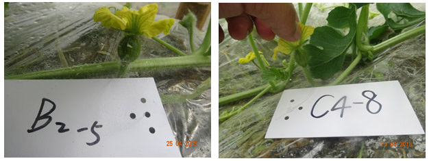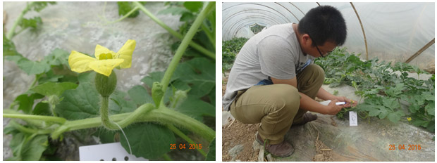7、使用調節劑。在雌花開放當天或前一天,使用0.1%氯吡脲噴瓜胎,噴施時要均勻,噴正反兩面。一般在溫度低于18度使用0.1%氯吡脲10ml兌水1.5kg左右噴瓜胎,溫度在18-24度使用0.1%氯吡脲10ml兌水1.5-2kg,溫度25-30度使用0.1%氯吡脲10ml兌水1.5-3kg噴瓜胎可促進座瓜,提高座瓜率。